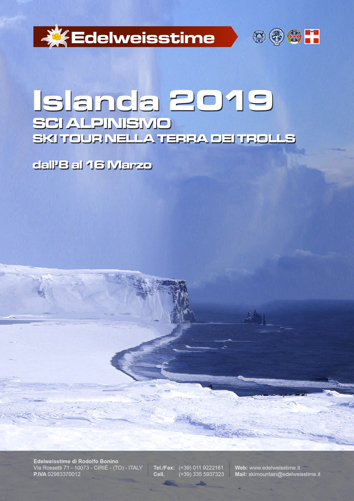2019 – Islanda – Sci Alpinismo Data: 8 – 16 Marzo 2019 Terra del ghiaccio, nella lingua Islandese si compone di tre parole Eyja – fjalla(montagna) e jokull (calotta glaciale). Grande isola a ridosso del circolo polare artico, originata dal magma fuoriuscito dalla dorsale che separa le due placche oceaniche dell’Atlantico, caratterizzata da paesaggi i cui contrasti e la potenza della natura, lasciano senza fiato. Gli appassionati dello sci alpinismo, scopriranno la “ magia” delle cime della penisola di Trollaskagi o penisola dei Trooll, le cui ripide e superbe discese regalano scenari unici. Immersi negli splendidi fiordi, passando tra villaggi di pescatori, si potranno raggiungere le cascate di Fossholl e Gullfoss, il lago e le piscine termali di roccia lavica di Myvatn.Numero di partecipanti: minimo 6 persone |